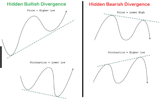 Hidden bullish divergence is in a uptrend and hidden bearish divergence is in a downtrend.