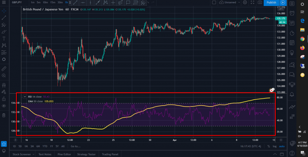 This example will be on the 1 hour time frame but can be used on any time frame. We are going to be using RSI set at 21 and a moving average of 13. This will be your indicator on indicator.